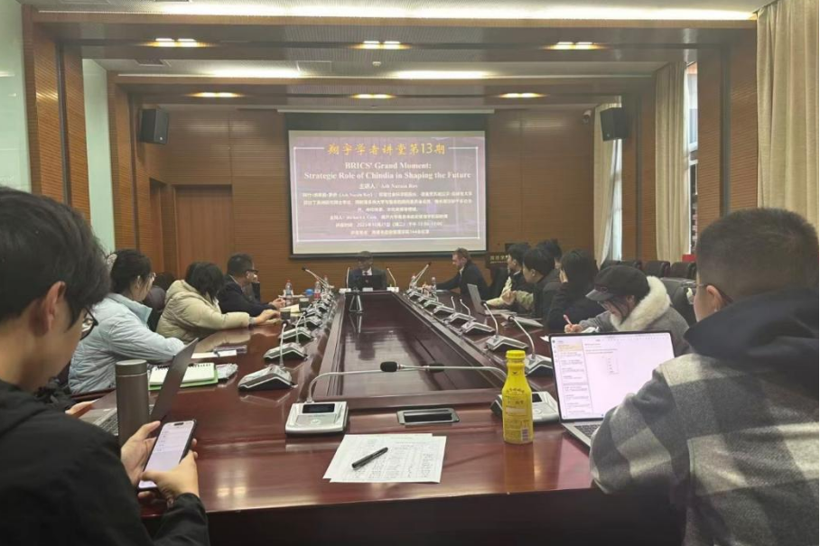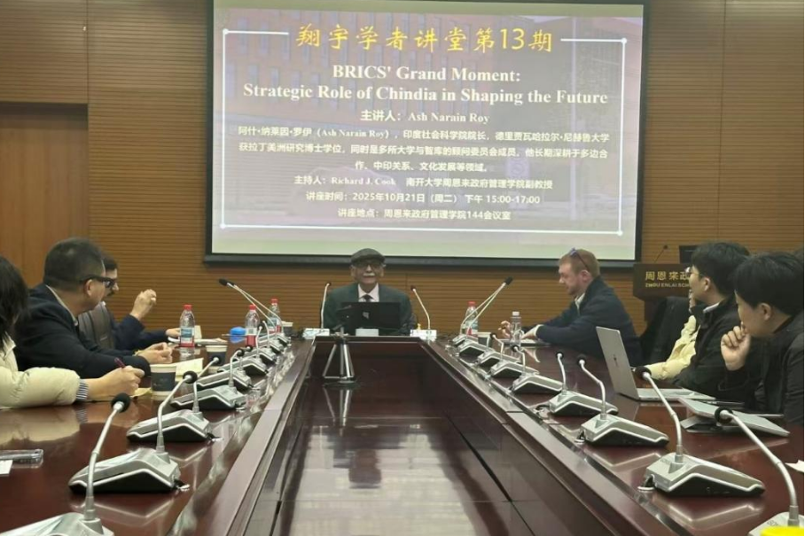 2025年10月21日下午,南开大学周恩来政府管理学院翔宇学者讲堂第13期,BRICS' Grand Moment: Strategic Role of Chindia in Shaping the Future在周恩来政府管理学院144会议室成功举办。本次讲座特邀印度社会科学研究院院长、资深教授、知名国际政治学者、多所大学与智库的顾问委员会成员Ash Narain Roy老师主讲。周恩来政府管理学院Richard J. Cook副教授主持,柳建文教授、吴亚博老师参加,共同聚焦历史回归与世界失序这一牵动全球格局的核心议题,围绕地缘政治变革、全球治理转型等议题展开深度对话,探讨中印双方在塑造未来中的战略作用,碰撞出跨文明视角下的思想火花。