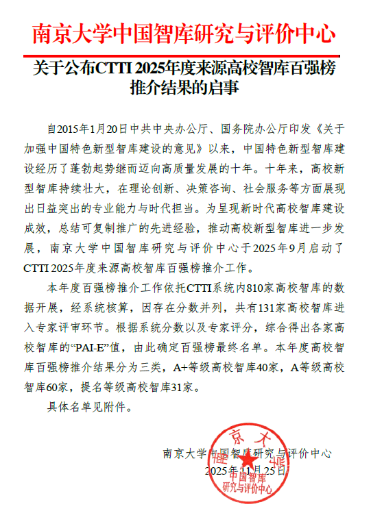 论坛发布了CTTI 2025年度来源高校智库百强榜以及2025 CTTI 智库建设最佳案例与智库研究优秀成果征集结果。本次高校智库百强榜共吸引了全国810家高校智库申报,天津市有7家智库入选,南开大学中国政府发展联合研究中心位列其中,成功入选CTTI 2025年度高校智库百强榜,也是南开大学所入选的3家智库的其中之一,彰显了中心在新型智库建设方面的持续成果与影响力。