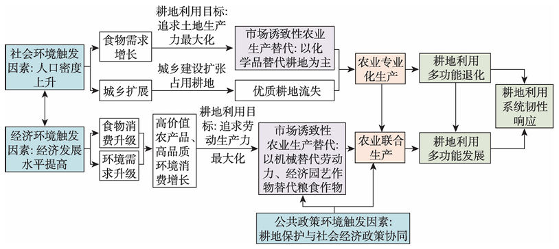 与相关研究显著不同的是,论文回归韧性曲线的科学本质,创新性地提出了耕地利用系统韧性曲线及其测度模型。在此基础上,分析了1988—2017年耕地利用系统韧性变化。论文发现,社会经济和公共政策环境因素对耕地利用系统韧性变化具有重要影响,表现为“人口密度上升、经济发展与耕地保护制度实施—耕地利用目标调整—市场诱致性农业生产替代—农业专业化生产转向联合生产—耕地利用多元功能错位协同发展—耕地利用系统韧性提升” 的级联驱动作用。其中,人口压力触发的市场诱致性农业生产替代转变机制和经济—政策协同环境下的农业生产模式转型机制,是韧性变化的关键机制(图2)。