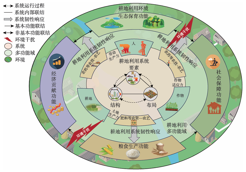 论文界定了耕地利用系统韧性的理论内涵,从环境干扰下的农业专业化生产与耕地利用多功能退化、农业联合生产与耕地利用多功能发展等方面,构建了耕地利用系统韧性理论框架(图1)。