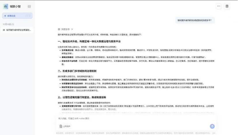 由周杰、冷雪忠、贾小岗、吴嘉淇、来雨彤组成的城市发展与管理专业团队,开发了一套“城联小智”智能体。该智能体聚焦城市群安全智慧协同治理,以四大治理目标为核心,通过数据驱动实现跨区域安全资源优化配置,避免资源浪费;监测产业链风险以推动产业协同发展,提升产业集群韧性;整合交通数据优化调度,保障人员物资安全流动;实时监控环境数据,实现生态与经济平衡发展。