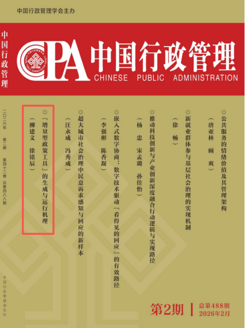 近日,《中国行政管理》期刊公布了2026年第2期目录。南开大学周恩来政府管理学院教授柳建文与博士研究生徐铭辰合作撰写的论文《“增量型政策工具”的生成与运行机理》一文作为封面文章发表。