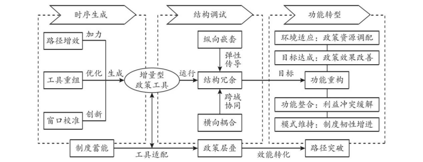论文以结构功能主义和历史制度主义为理论视角,针对既有研究对增量型政策工具阐释的不足,构建了“时间-结构-功能”的分析框架,系统阐释了增量型政策工具的生成以及推动政策系统渐进式创新的核心机制。文章明确了增量型政策工具以渐进决策理论为依据的核心特征,从时间、结构、功能三大维度厘清了其运行逻辑:在时间维度,通过路径增效激活存量工具、工具重组整合要素、窗口校准把握关键节点完成“制度蓄能”,生成适配环境需求的增量工具;在结构维度,依托纵向嵌套打通央地传导、横向耦合突破部门壁垒、结构冗余储备抗风险能力实现“政策层叠”,让增量工具适配政策系统;在功能维度,通过动态调配资源、边际改善效能、推动制度转型、增进制度韧性达成“效能突破”,三者形成“制度蓄能-政策层叠-效能突破”的动态变迁路径,推动政策在渐进调试中不断创新完善(图1)。
