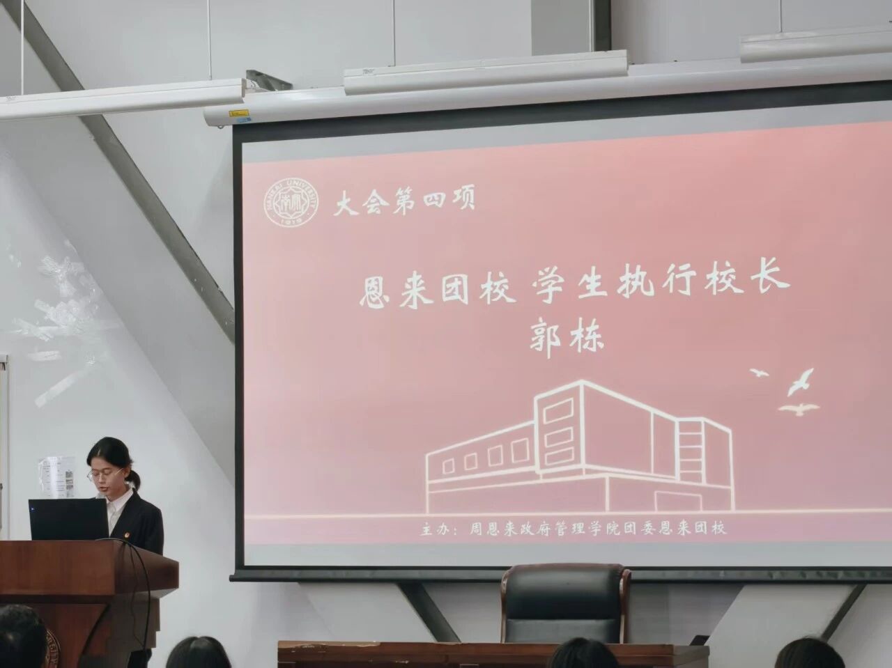恩来团校作为周恩来政府管理学院团委下属的培育先进团员和团学骨干的重要载体,致力于培养出素质全面、能力突出的共青团员和团学骨干,提高团员周政青年对学生团员、党员职责与使命的认识,培育其“公能”精神。为此,恩来团校在二十多年的发展中不断开拓创新,立足学生实际,响应时代需求,为学员设计了一系列优质团课,不断宣扬党的先进理论,培育周政学子的爱国情怀,引导周政青年塑造正确的价值观,成为时代需要的杰出人才。