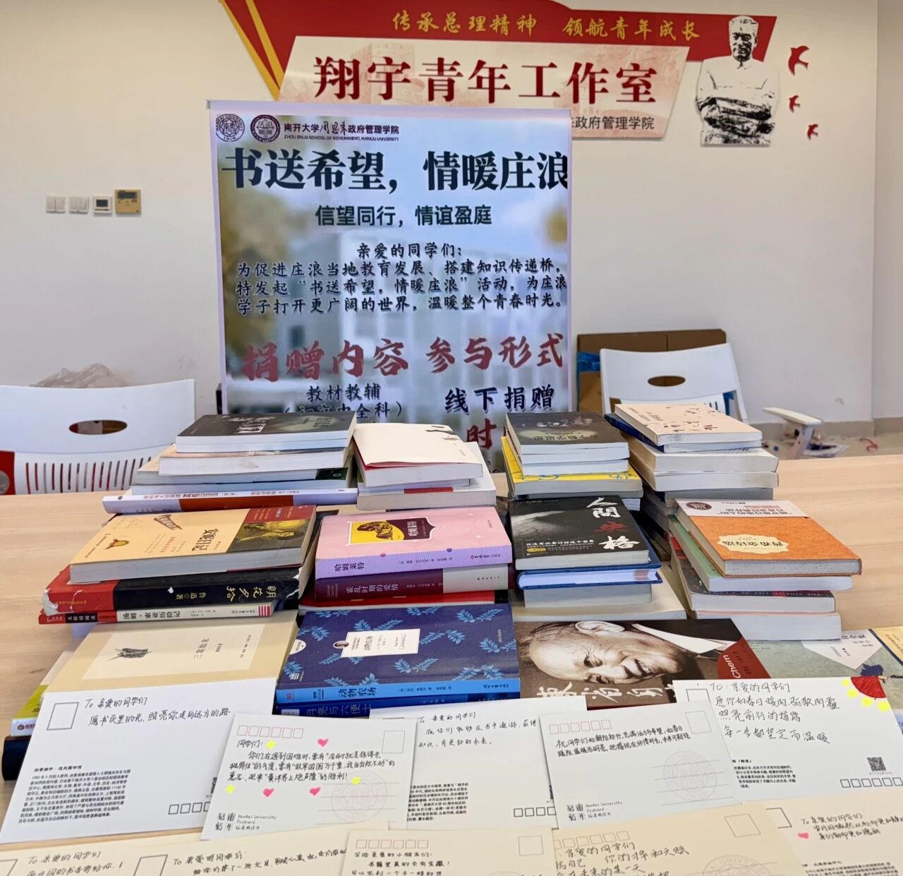 本次活动通过“线上+线下”结合的方式日日募集,广泛动员。依托政府学院公众号等平台发布倡议,并在津南校区设立固定捐赠点。历时数月,汇集起了师生们的爱心分享。许多捐赠者在明信片上写下寄语,随书一同寄往庄浪。四中的同学们在收获知识的同时,更从中感受到了来自南开学子的真挚陪伴。这份跨越山海的情谊,引发了温暖的回响。