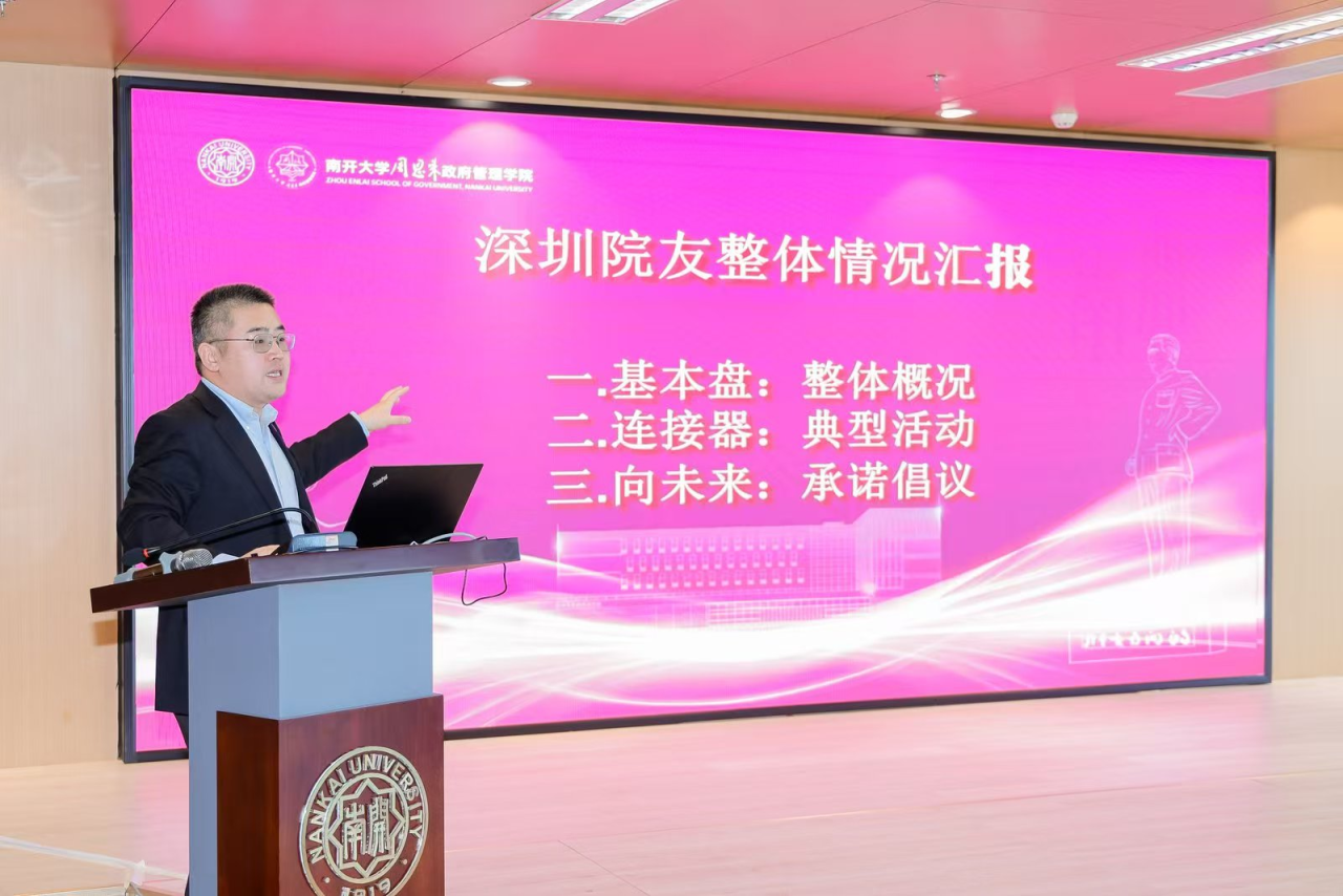 1999级国际政治专业本科生、南开深圳校友会执行会长兼秘书长李薇介绍了南开大学深圳校友会的情况,2005级政治学与行政学专业本科生、南开深圳校友会常务副会长兼执行秘书长、学院校友会副秘书长李心虎介绍了学院在深校友的整体情况。他们表示,校友们始终心系母校和母院,积极参加深圳校友会的各项活动,充分展现出南开周政人团结向上、互助友爱的精神风貌。