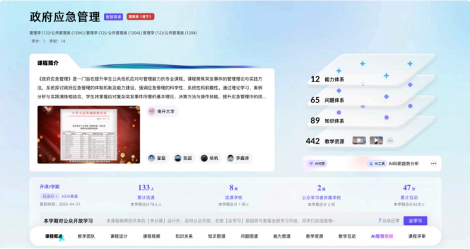 为响应高等教育数字化转型战略,深度挖掘国家级一流本科课程的⽰范引领作用,近日,南开大学周恩来政府管理学院翟磊教授团队与智慧树网深度合作,将线下国家级一流本科课程《政府应急管理》成功升级为“智慧慕课”。该课程目前已在智慧树网平台正式面向全国高校运行共享,标志着应急管理教学进入了“全链路数智化”引领的新阶段。