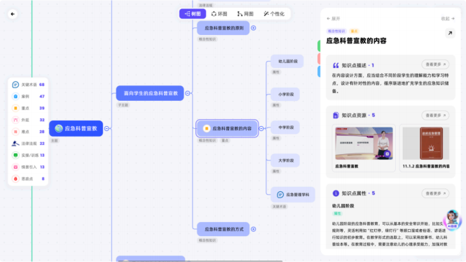 作为图谱的最底层支撑,资源图谱实现了教学素材的精准化调度。数千分钟的微课视频、数百份深度案例分析、政策法规库及实战模拟题,均以高颗粒度的形式精准挂载于知识点下方。学生在查阅某一知识点时,即可同步获取相关的全要素资源支撑,真正实现了“点对点”的资源分发与“即查即学”的极致体验。