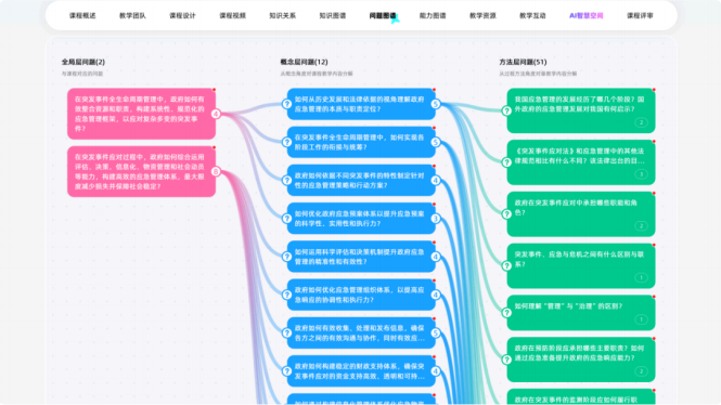 本课程创新构建了由“全局层、概念层、方法层”组成的递进式问题图谱,将复杂的应急管理知识体系转化为由2个战略全局、12个核心概念及51个实操方法构成的逻辑阵列。图谱紧扣突发事件全生命周期管理,从顶层的应急架构设想、中层的管理职能统筹,到底层的法律规制与监测预警,以“层层剥笋”式的问题链条替代传统的章节陈述,不仅清晰呈现了知识间的逻辑脉络,更引导学生在探究“如何构建系统化框架”到“如何履行具体职能”的过程中,实现从理论认知到专家级实战思维的数智化跨越。