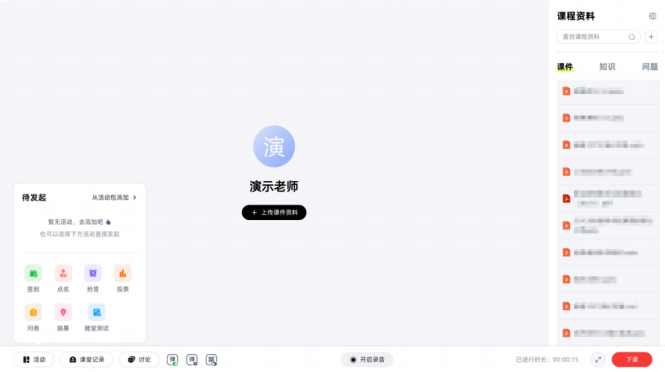 课堂教学不再是单向输出。教师利用平台“开课”功能,可一键发起签到点名、实时投票、弹幕互动等操作,极大提升了课堂活跃度;同时,AI空间可记录课堂教学数据,辅助教师精准调整授课节奏。