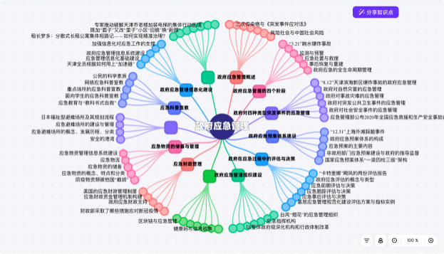 打破传统教材的章节藩篱,将政府应急管理数以百计的知识点进行原子化拆解与关联。知识图谱清晰呈现了知识点间的前驱、后继及逻辑关联,帮助学生建立起跨学科、全维度的应急管理知识本体,实现从“碎片化记忆”向“系统化认知”的飞跃。