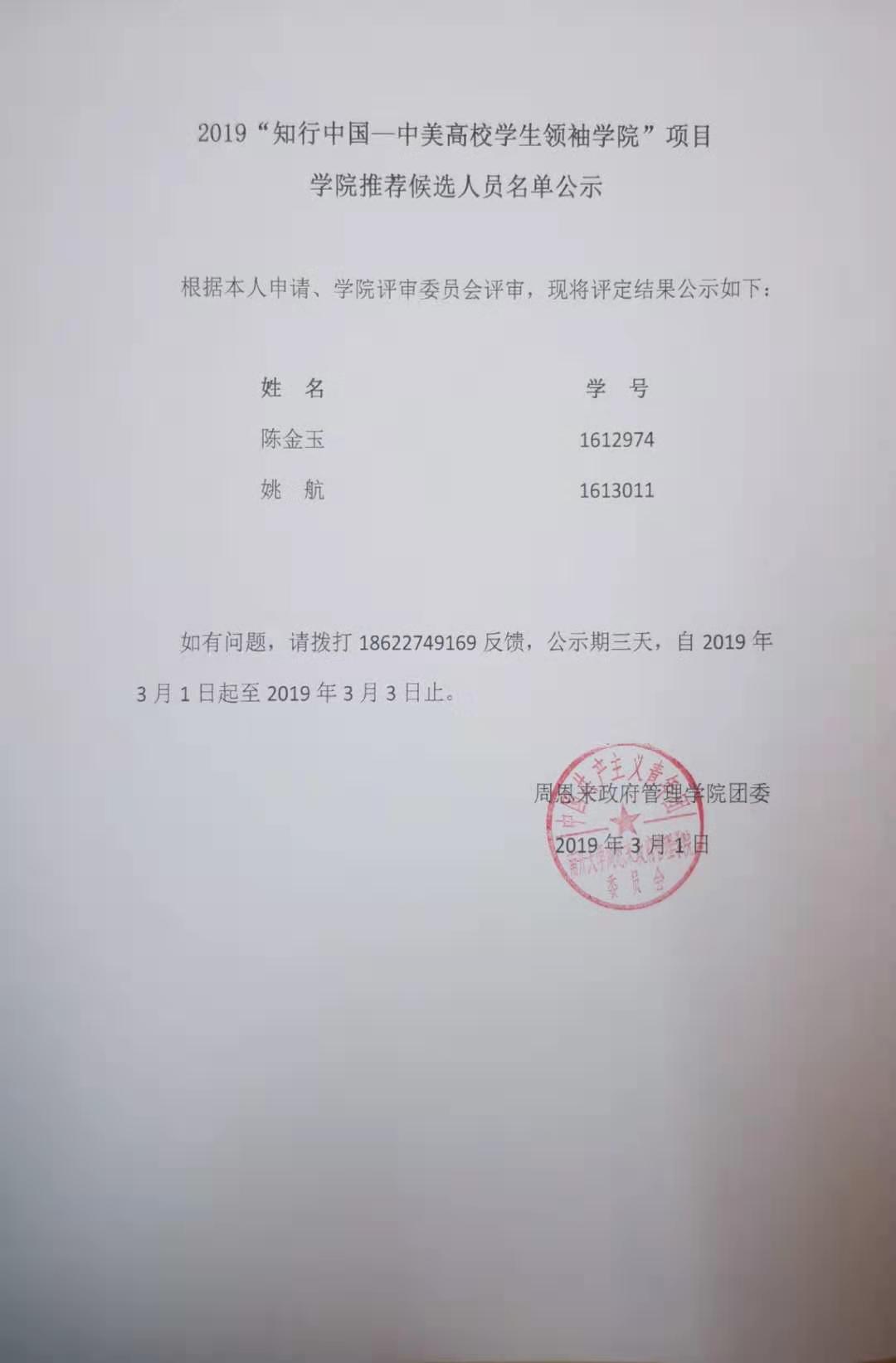 2019“知行中国—中美高校学生领袖学院”项目学院推荐候选人员名单公示